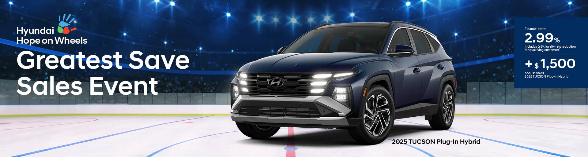 *2025 TUCSON Ultimate PHEV AWD finance offer includes a 0.5% Hyundai finance loyalty rate reduction. All current owners (and immediate family members with proof of residence at owner’s address) of a Hyundai or Genesis vehicle who present active (not expired) proof of ownership at time of purchase or lease are entitled to a reduction of 0.5% on the applicable finance, a reduction of 1% on the applicable lease rate, or an after-tax rebate up to $500 for cash purchases (collectively, “Loyalty Incentive”). The rate reduction and cash rebate cannot be combined. Finance rate after 0.5% rate reduction cannot be less than 0%. Lease rate after 1% rate reduction cannot be less than 0%. Loyalty Incentive can be claimed once in total from owner and immediate family member at same address. Cash price does not include freight, delivery and destination, registration, insurance, license fees, PPSA and all applicable fees, levies, charges and taxes. Dealer may sell for less. Inventory is limited. Dealer order may be required. Loyalty Incentive is subject to change or cancellation without notice. Loyalty Incentive offer is valid until January 2, 2026, and is only available in Canada.